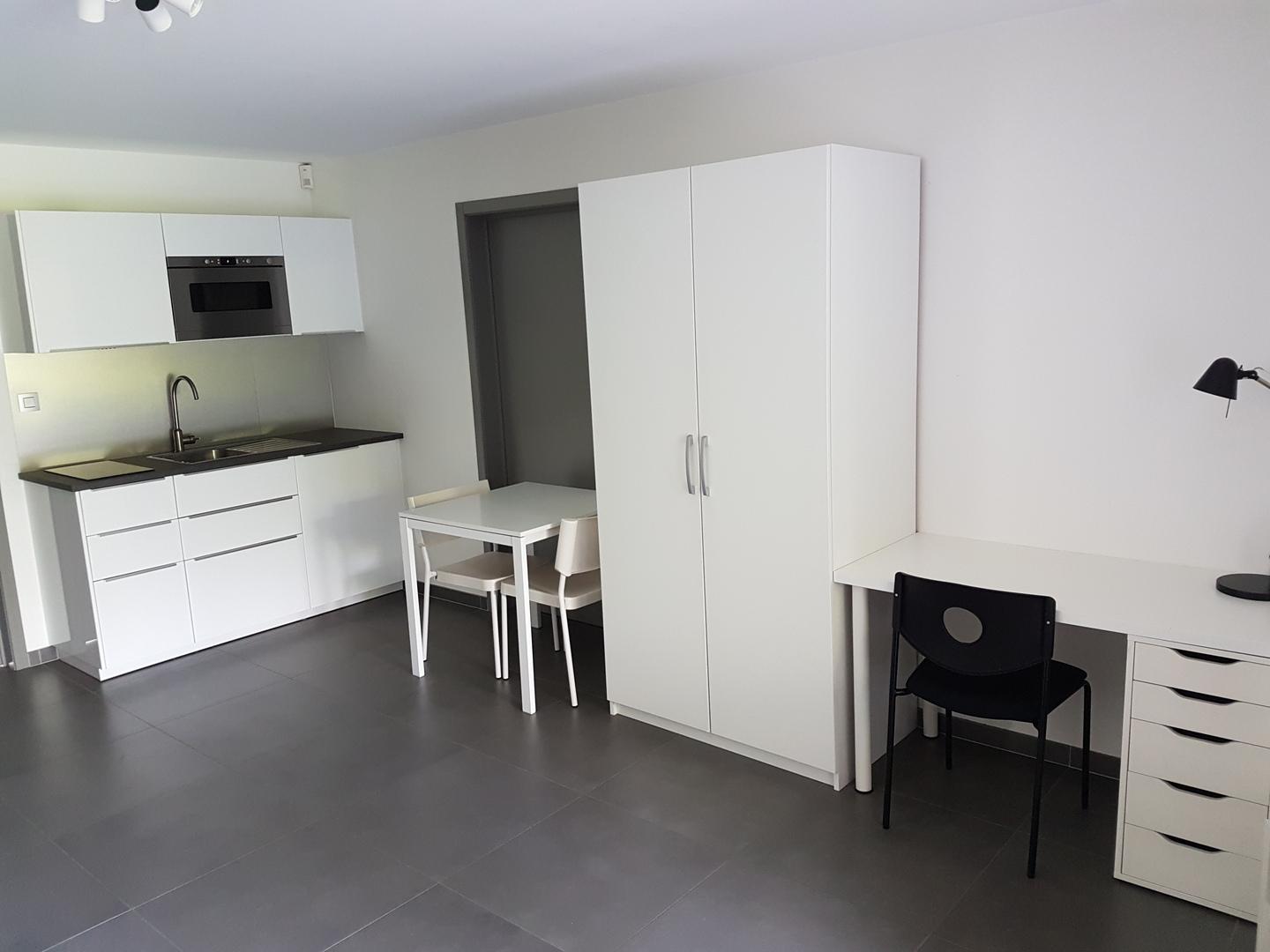 Agréable studio entièrement équipé dans construction récente. Cuisine neuve, mobilier: garde-robe, bureau, canapé-lit, étagère, TV. Vidéophone, alarme , télédistribution et internet, non fumeur, possibilité de profiter de la terrasse et du jardin. SEMAINE uniquement sauf périodes d'examens. Convention de location signée par un parent. Pas de domiciliation.