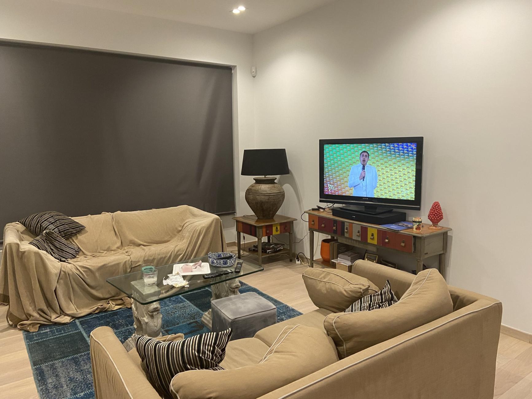 Ground floor: Living room with a 65-inch Smart TV - Open fully-equipped kitchen - dining room + furnished courtyard and garden