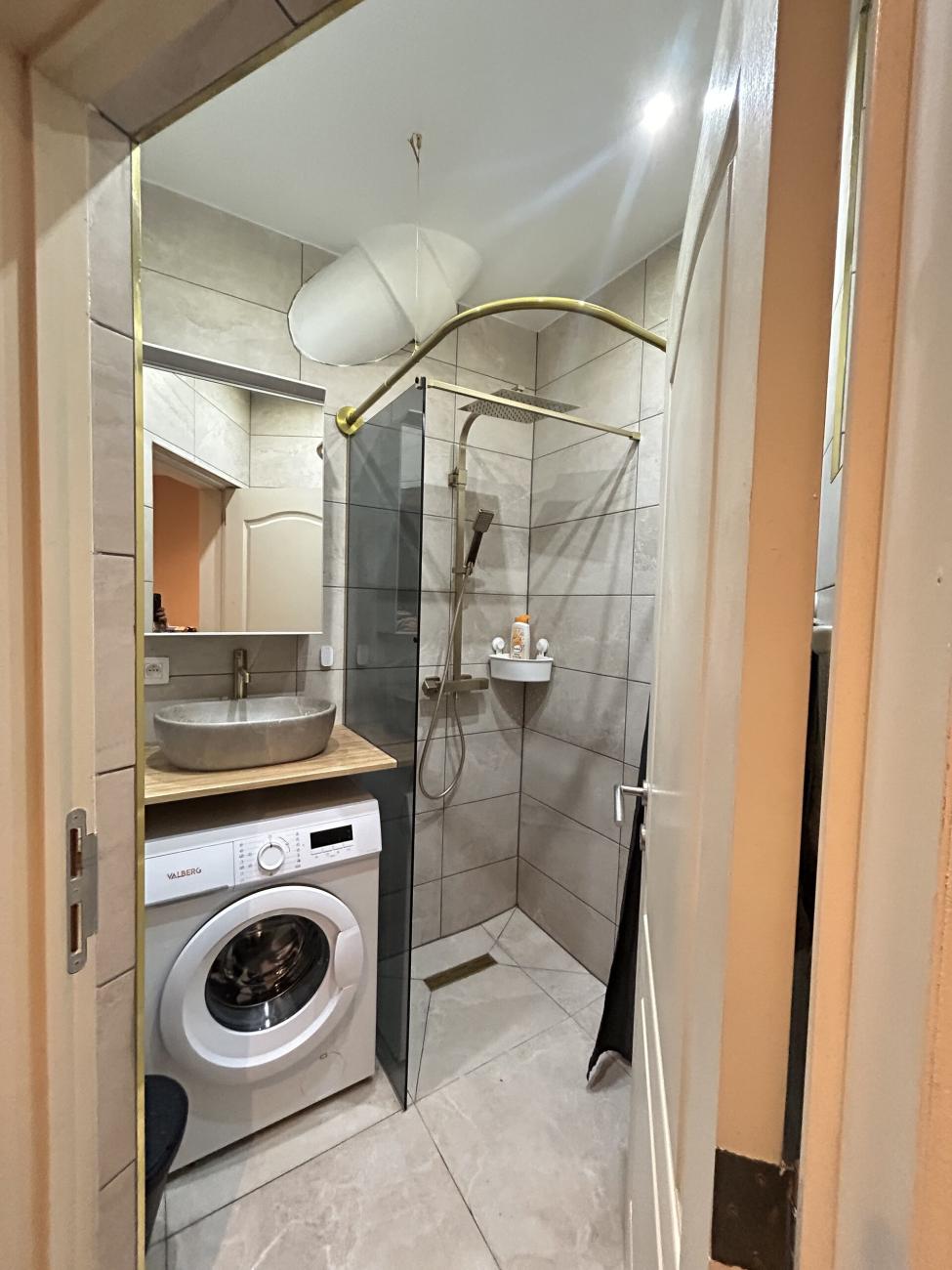 Salle de bain individuelle fraichement rénovée avec douche à l’italienne, vasque, meuble de rangement et machine à laver.