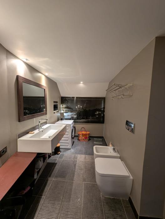 Total space: 75 sqm, with 50 sqm (living room, bedroom, bathroom) + 25 sqm downstairs (fully equipped kitchen and dining area).