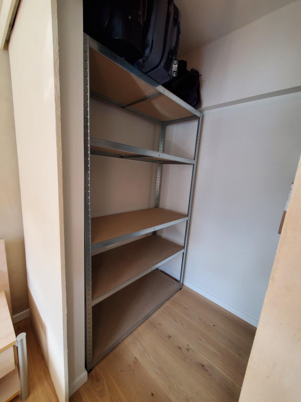 Chambre d'étudiant chez l'habitant avec sa salle de bain et son espace de rangement.