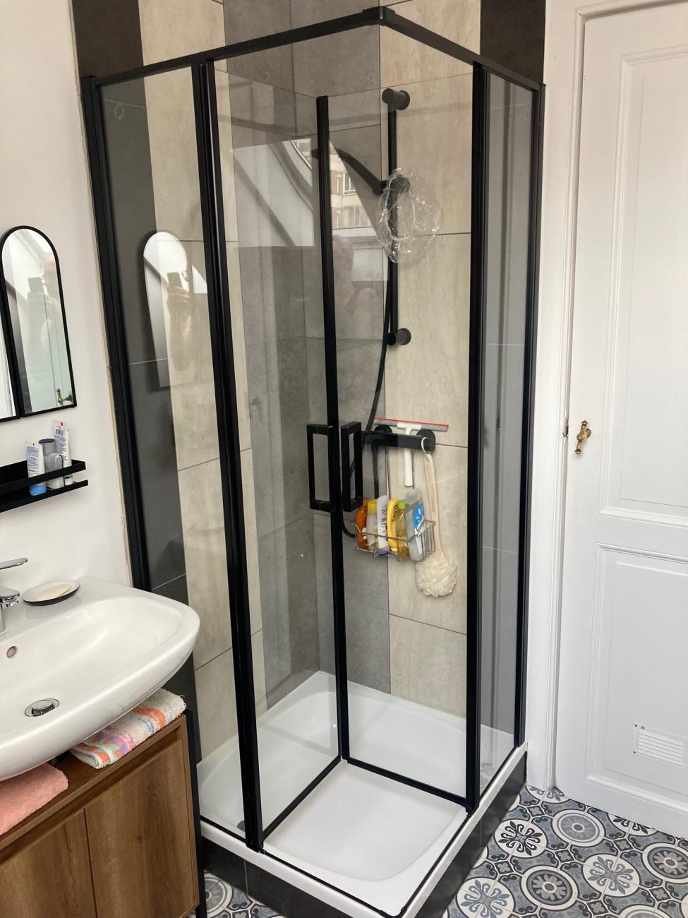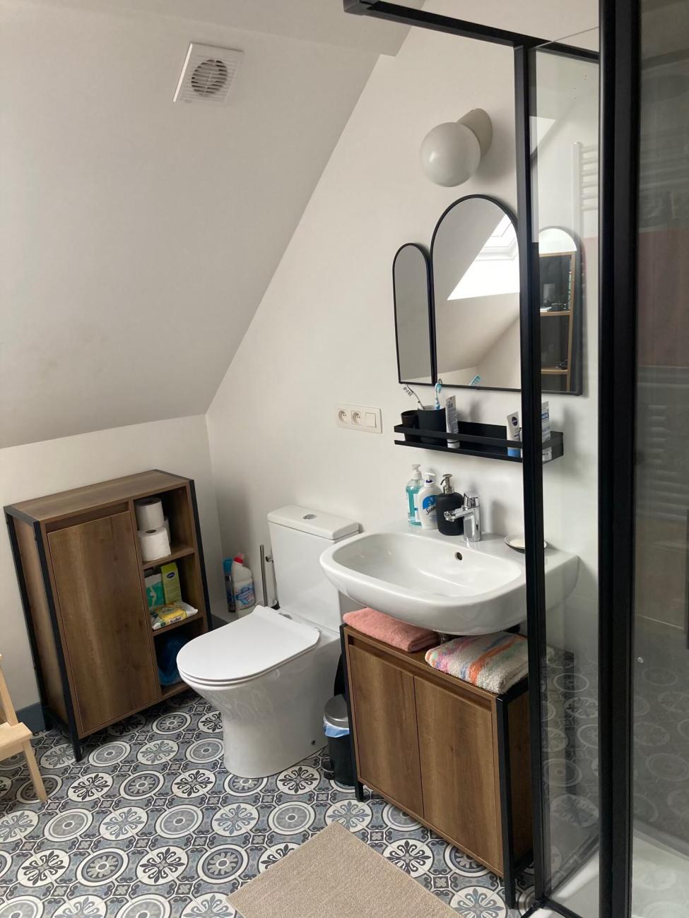 ° De badkamer heeft een douche, een wastafel, een handdoekradiator en een toilet.