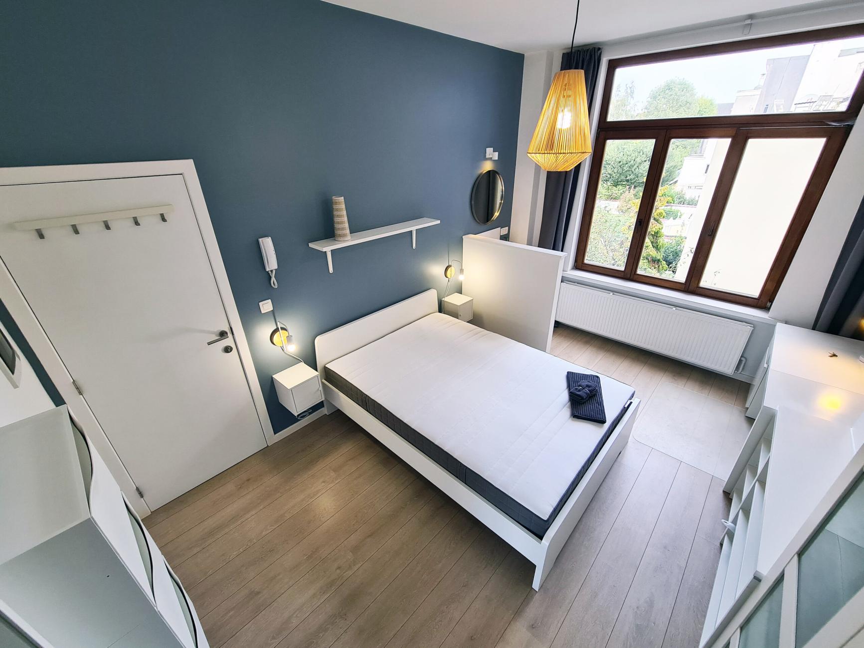 ✔️ Lit double, bureau, penderie, rangements