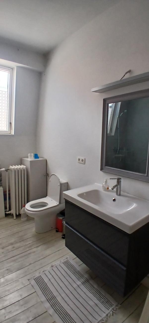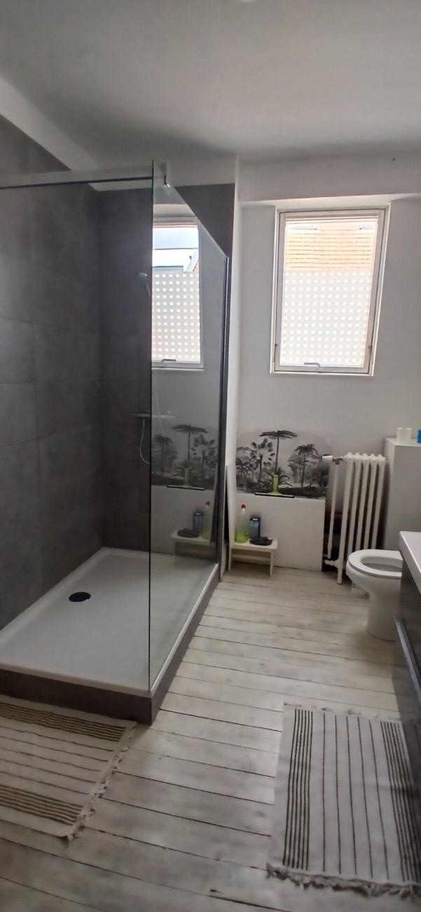 Juste à côté de la chambre, sur le même palier, nouvelle et grande salle de douche avec toilette, à partager (au même étage) avec deux autres étudiants très tranquilles, paisibles et respectueux.