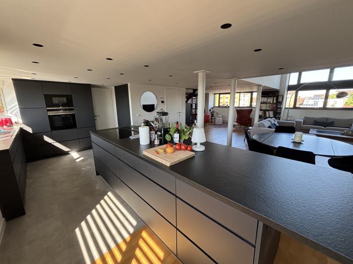 chambre lumineuse meublée dans loft moderne, salle de bains avec douche, WC et évier et d'une cuisine ultra équipée.