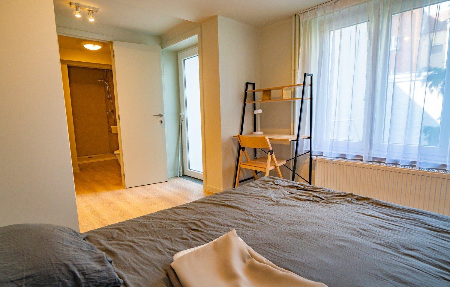 Beautiful room in the heart of Brussels: A bright and fully furnished room overlooking the garden, with the unique bonus of direct private access to the garden via its own staircase (while the room is not on the ground floor), offering both privacy and a special connection to the outdoor space. The room comes with a bed, desk, closet, and a large private bathroom, and is fully move-in ready. You’ll be living in a charming and welcoming house at Vieux Marché aux Grains in the vibrant Sainte-Catherine area, right in the city centre, with spacious shared areas, a fully equipped kitchen, laundry facilities, and a relaxed atmosphere. The house is shared with a friendly mix of young professionals and internationals, creating a social, open-minded and respectful vibe. The location is ideal, just a short walk from the city centre and surrounded by cafés, restaurants, and shops, with excellent public transport connections. Rent is €880/month, all charges included (utilities + high-speed internet).