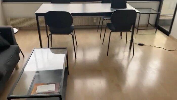 The living room comprises a tv with a dining table, chairs, sofa. The two rooms include two single beds, a desk, the ironing facilities and another TV for the big room.