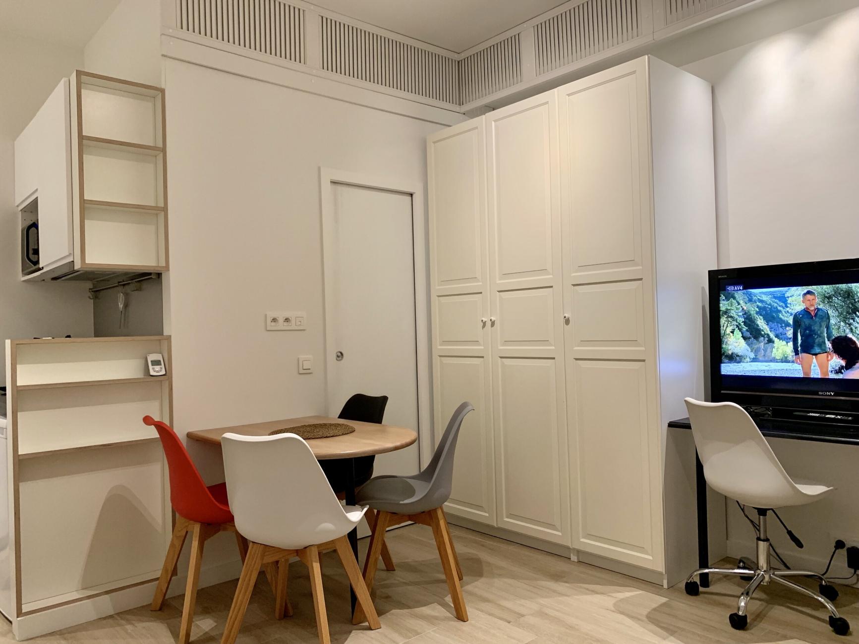 - espace de vie comprenant canapé-lit confortable de 160 cm de large, télé suspendue, bureau et chaise de bureau, table et 4 chaises
