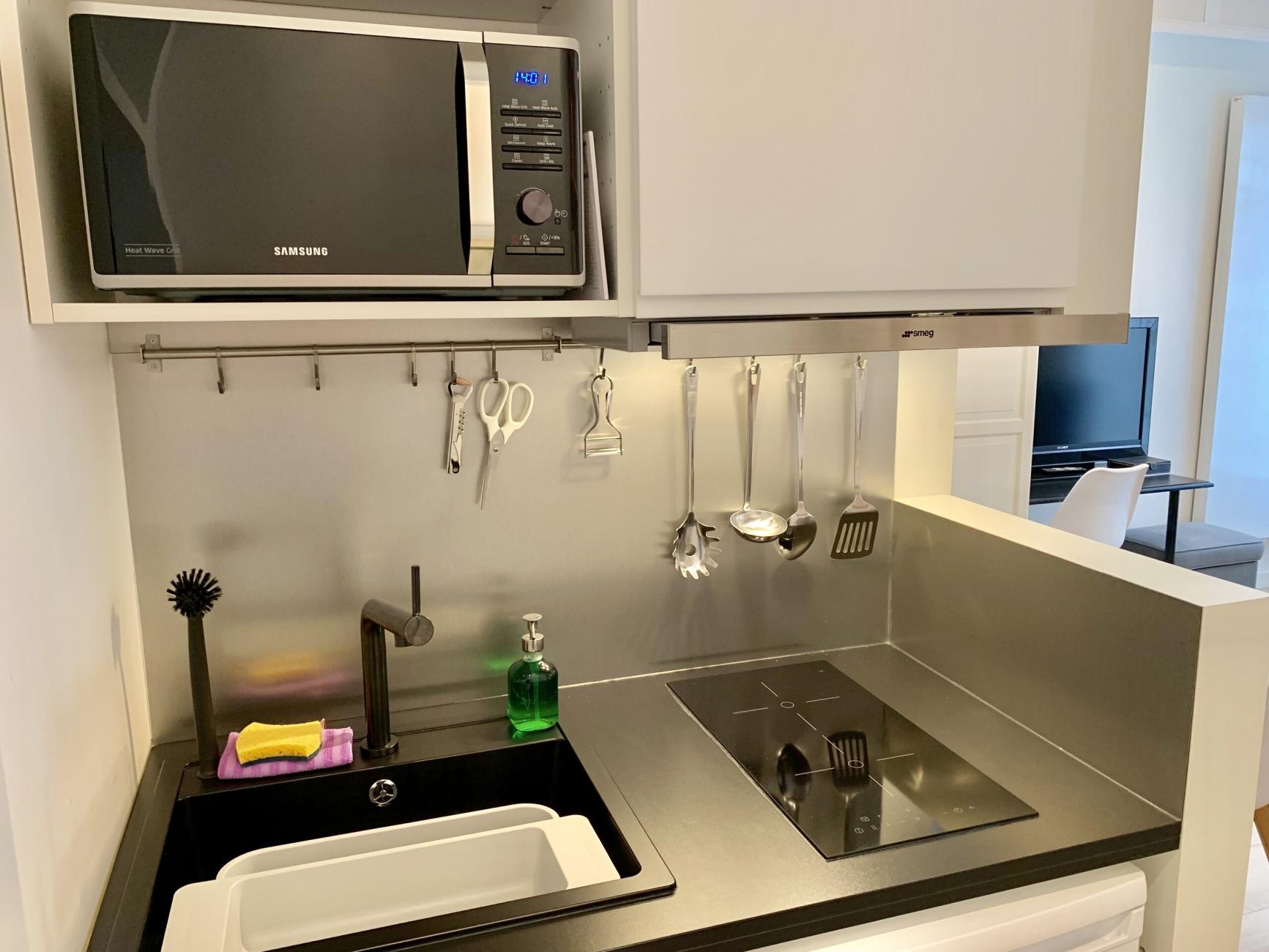 - kitchenette, plaque de cuisson, frigo, micro-ondes combi, poubelle de tri, vaisselle