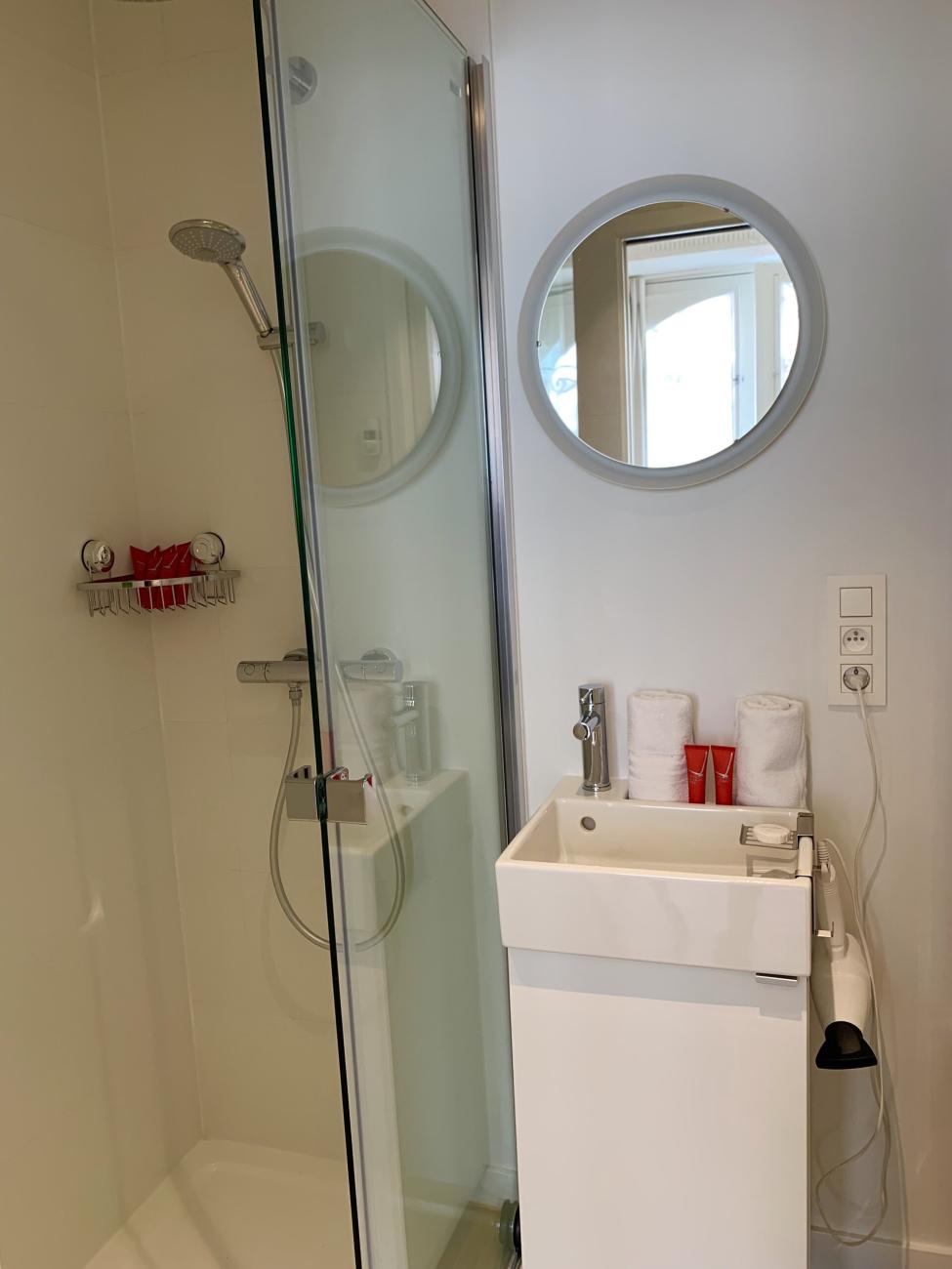 - salle de douche, lavabo, toilette Starck, sèche-serviettes, armoire de rangement