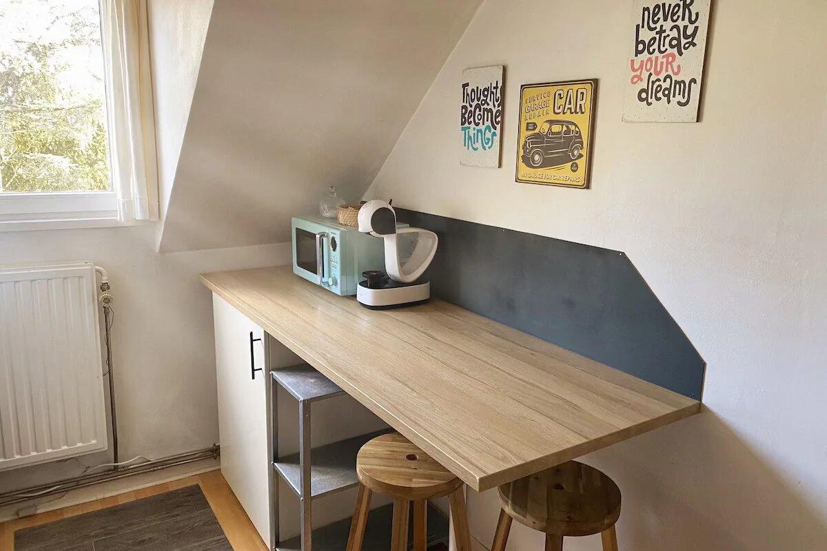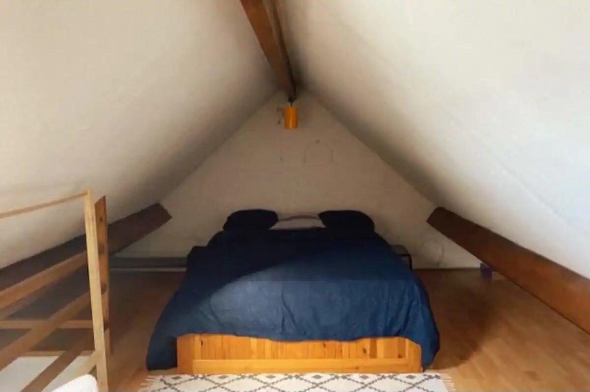 - Espace : Salon lumineux menant à une mezzanine ouverte (chambre) + une grande chambre séparée.