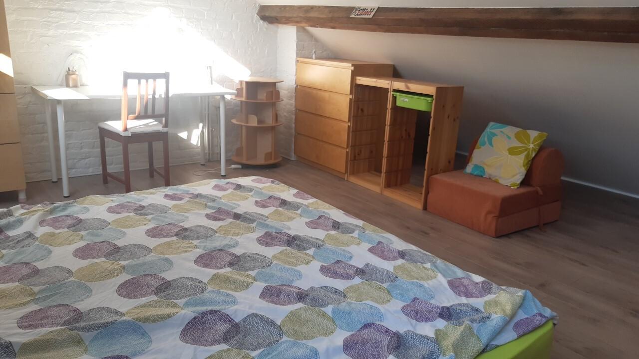 Le grenier comprend lit double, bureau avec lampe, étagères et tiroirs. Petit coin cuisine d'appoint avec: Four à micro-ondes, frigo, deux petites plaques de cuisson ainsi qu'un évier (eau chaude/froide). Accès à une toute nouvelle salle de douche à partager avec autre étudiant, garçon, très tranquille et respectueux, ayant sa chambre sur même palier.