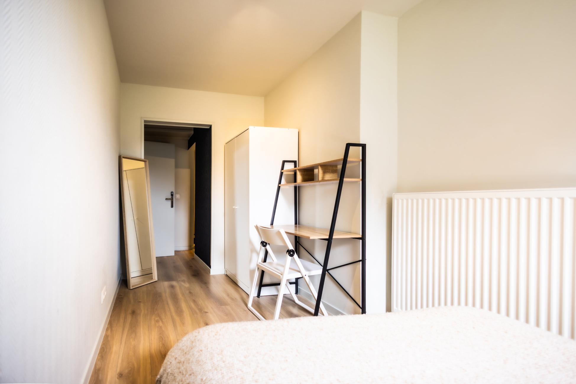 A bright and cozy private room with plenty of natural light, facing the street, and fully furnished with a double bed, desk, and storage space. The room also has its own private bathroom with a walk-in shower, offering extra comfort and privacy. Move-in ready and designed to feel like home from day one.