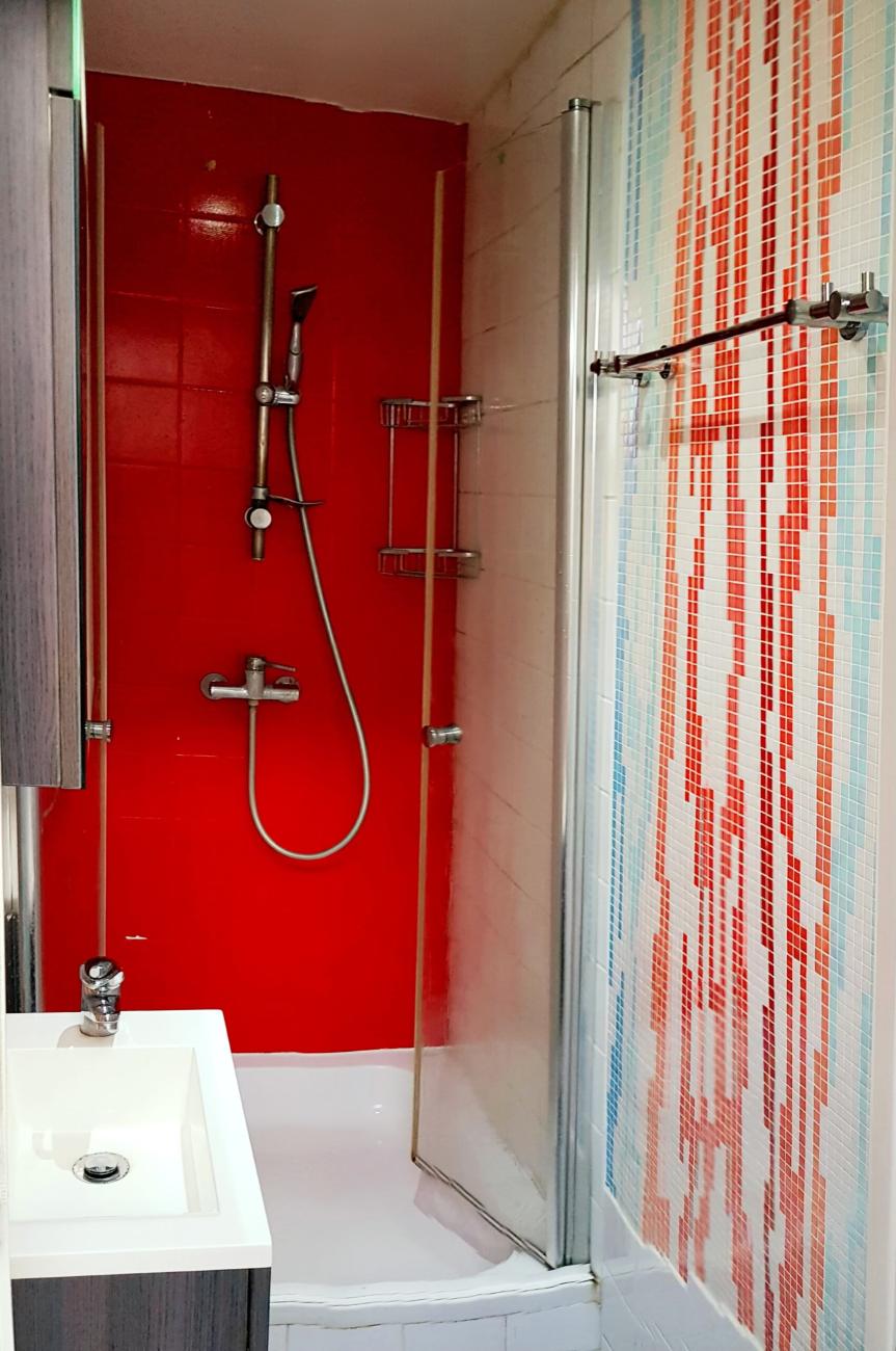 🛁 Carrelage pâte de verre haut de gamme • douche 90×90 • lavabo robinet infrarouge • rangements discrets.